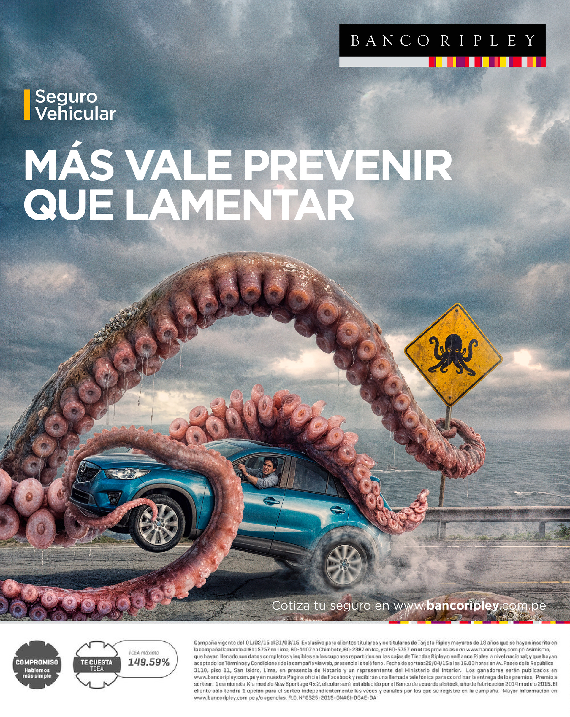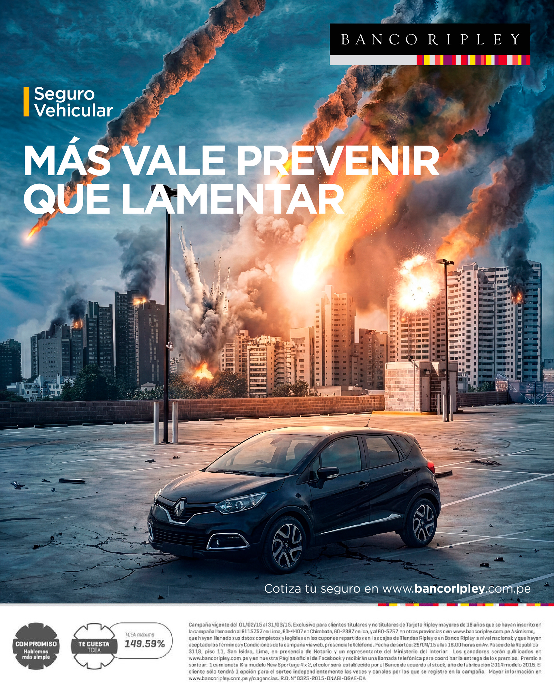 Vehicle insurance launch campaign for Banco Ripley, using humor to reinforce prevention and trust through extraordinary scenarios that highlight broad coverage as a key product differentiator.